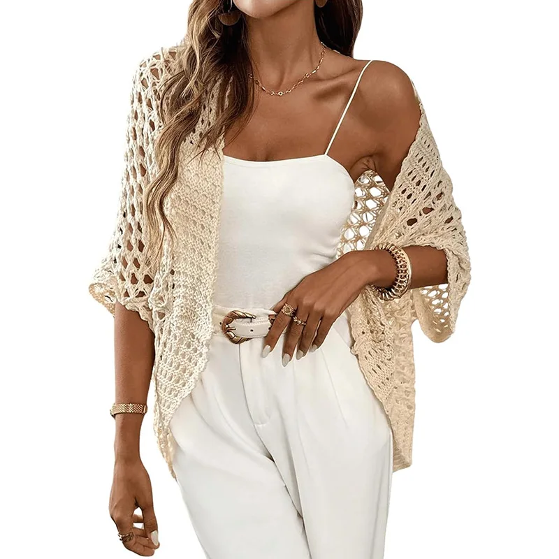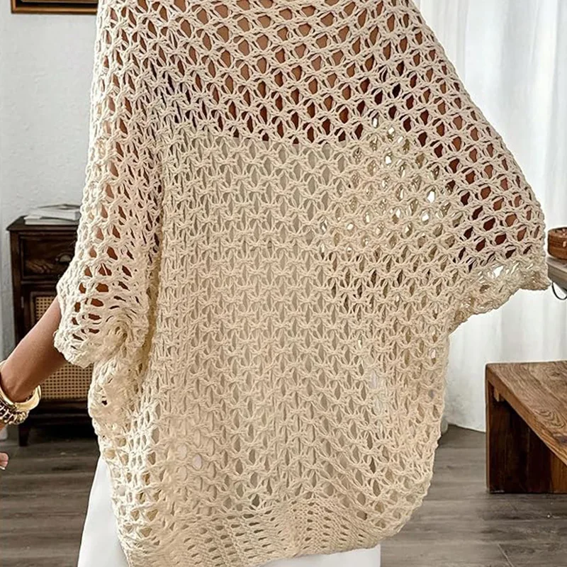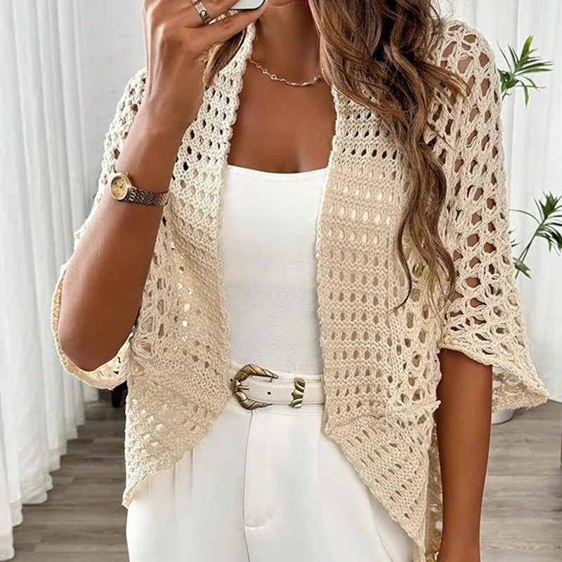 European American Women's Casual Half Sleeve Short Top Loose Fit Knitted Sweater Coat in Solid Color for Autumn Breathable